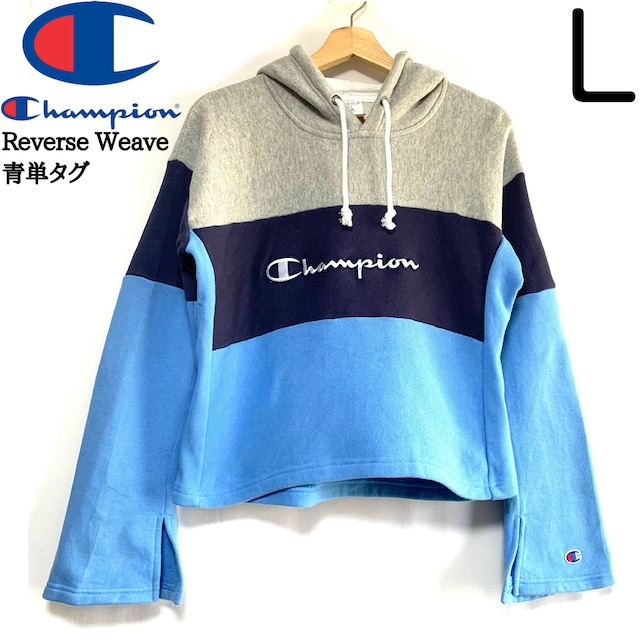 輸入古着 Champion チャンピオン リバースウィーブ クロップド パーカー トライカラー 青単タグ