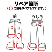 破れがある箇所(画像にあるリペア表に赤丸を付けている箇所)にリペアを施しています。裏から別布を貼り付けてタタキ修理をしています。