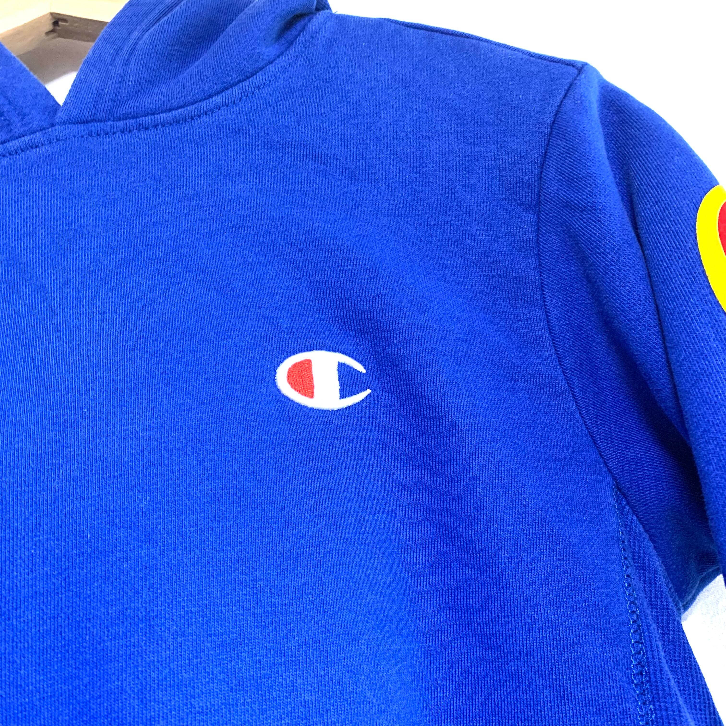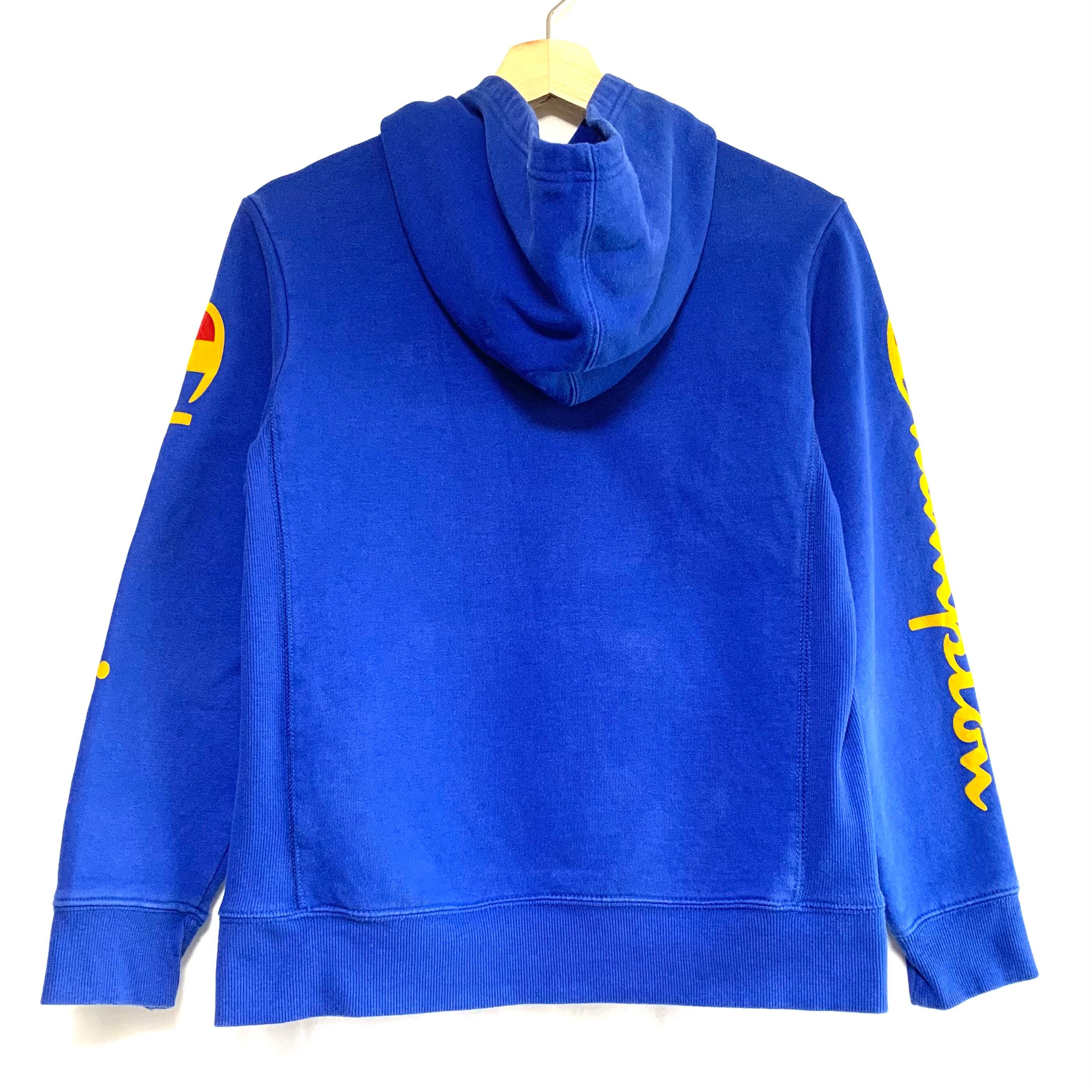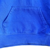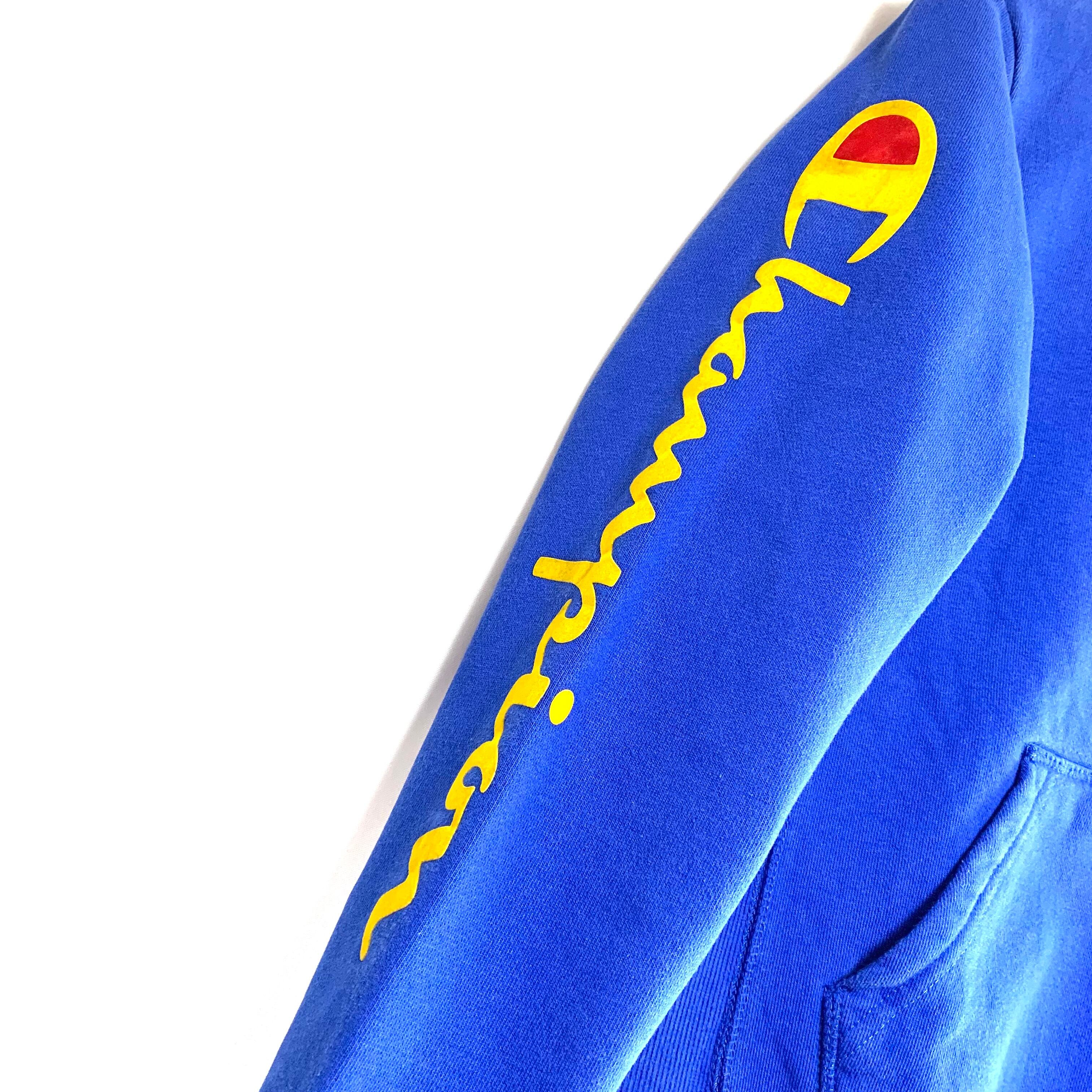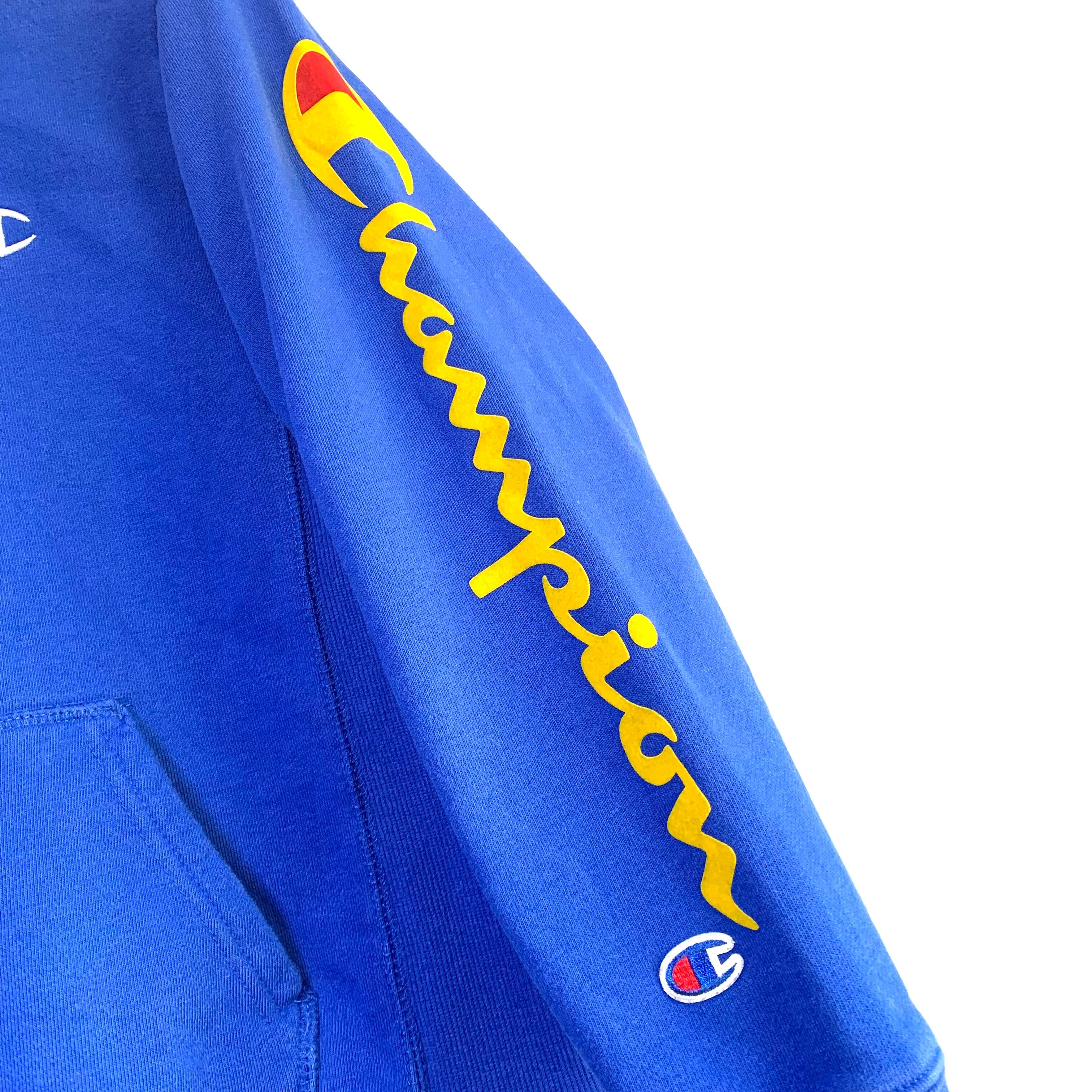 輸入古着 Champion チャンピオン スウェット パーカー ブルー 袖フロッキープリント