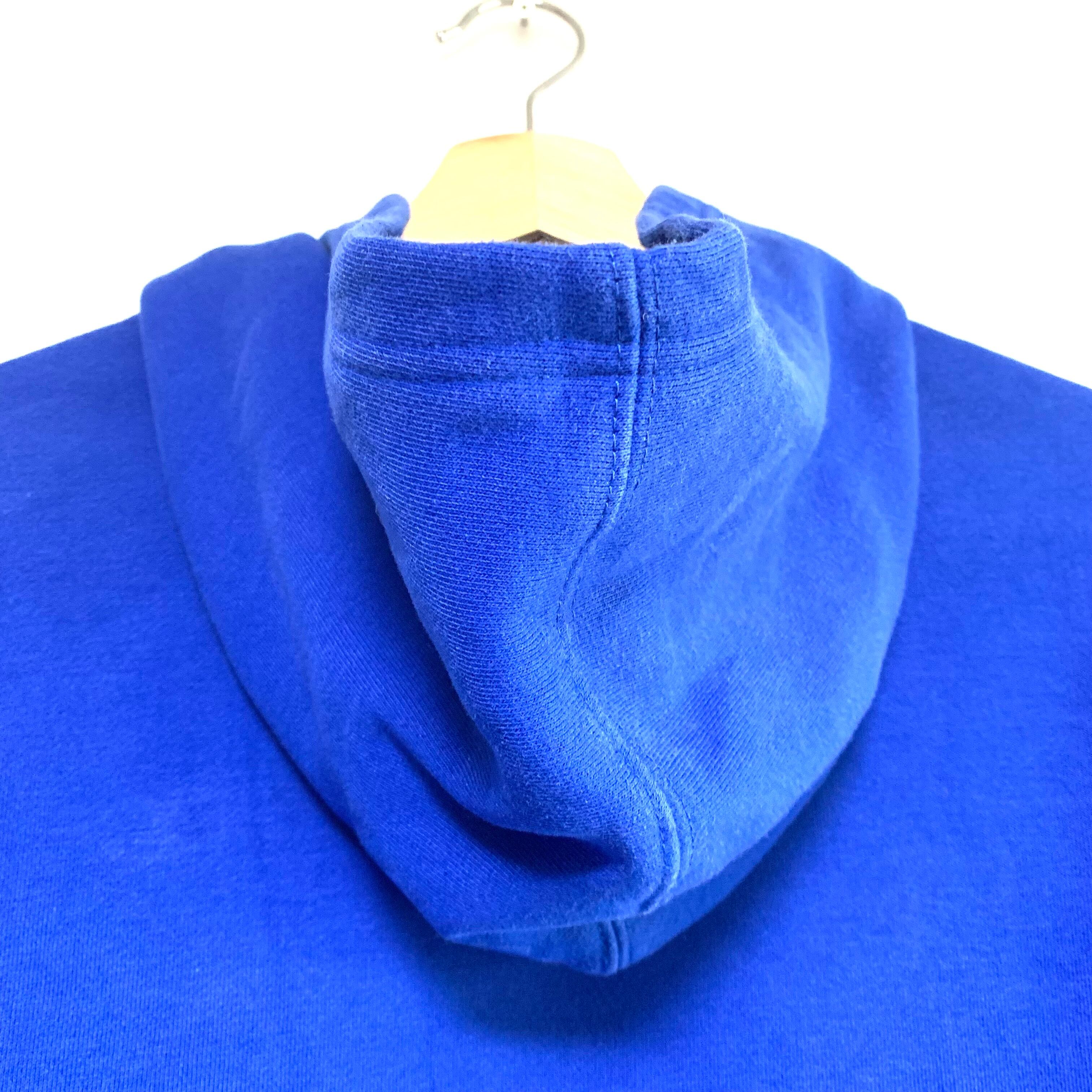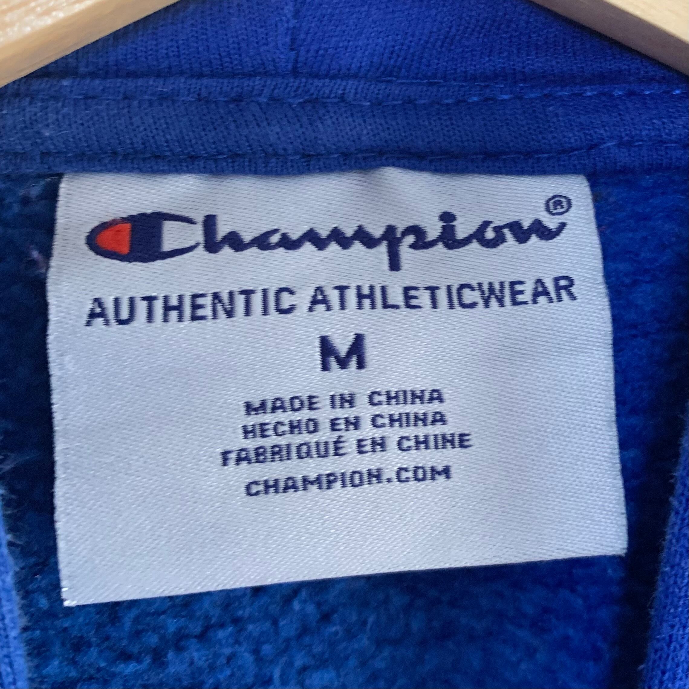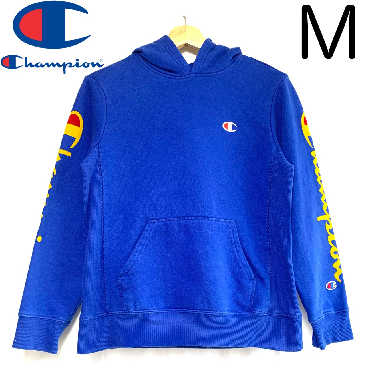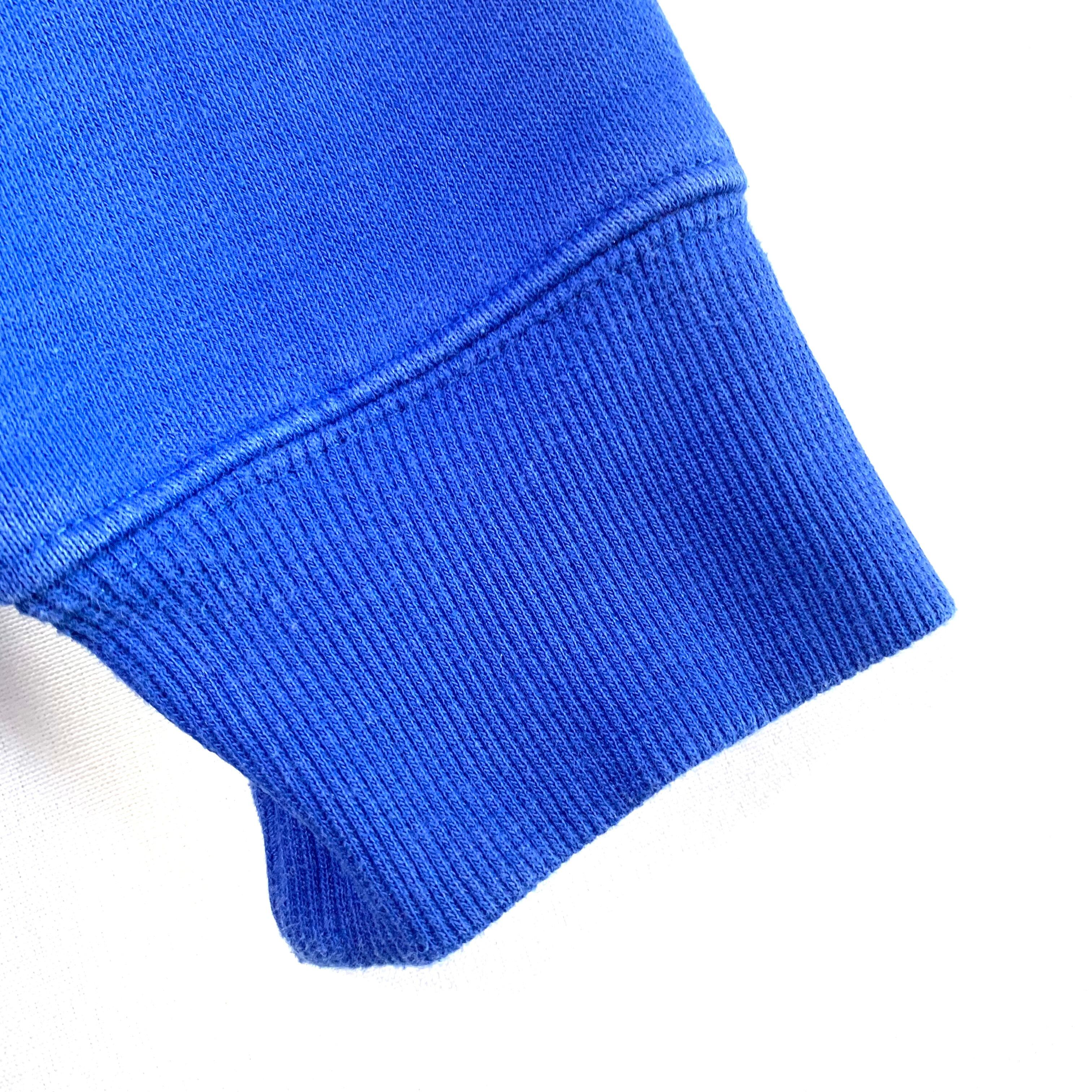 輸入古着 Champion チャンピオン スウェット パーカー ブルー 袖フロッキープリント