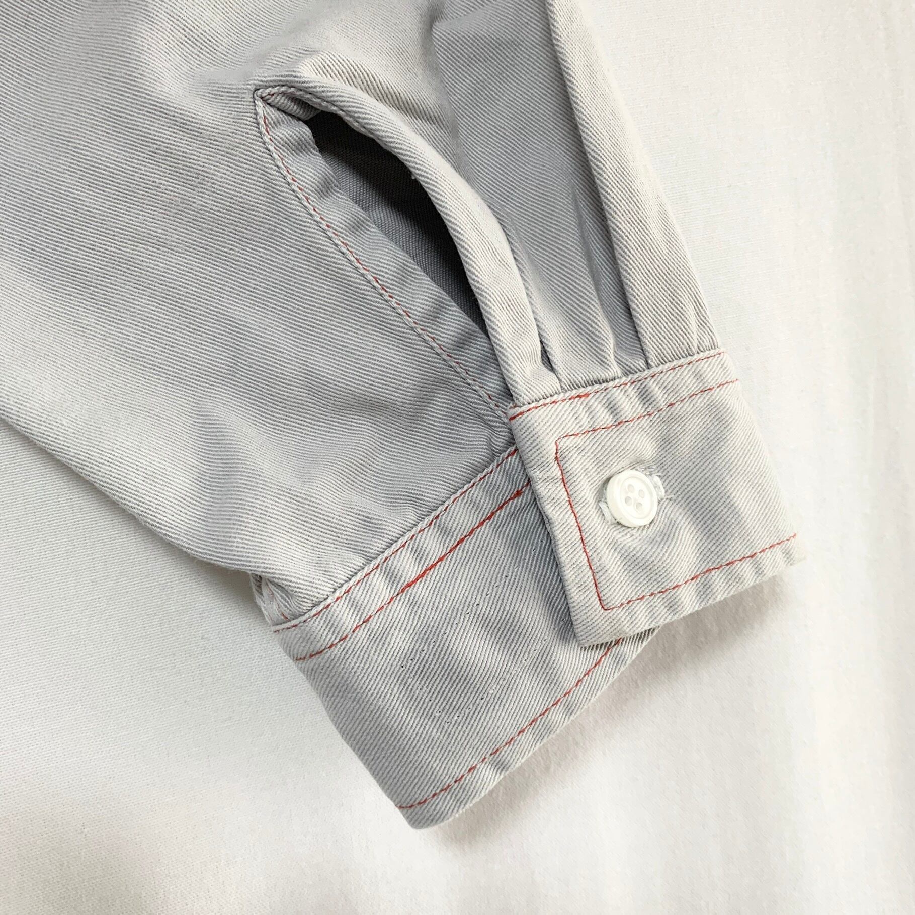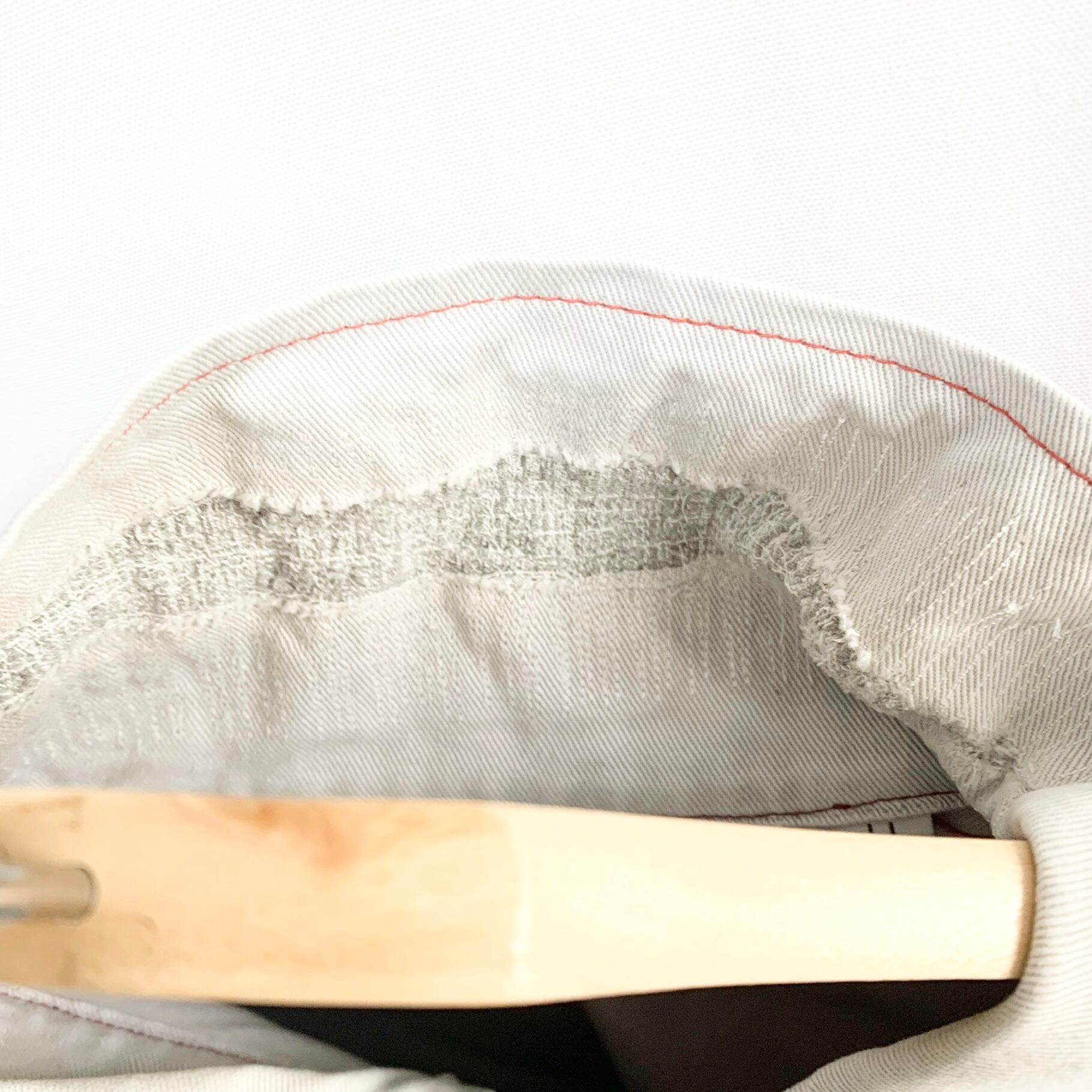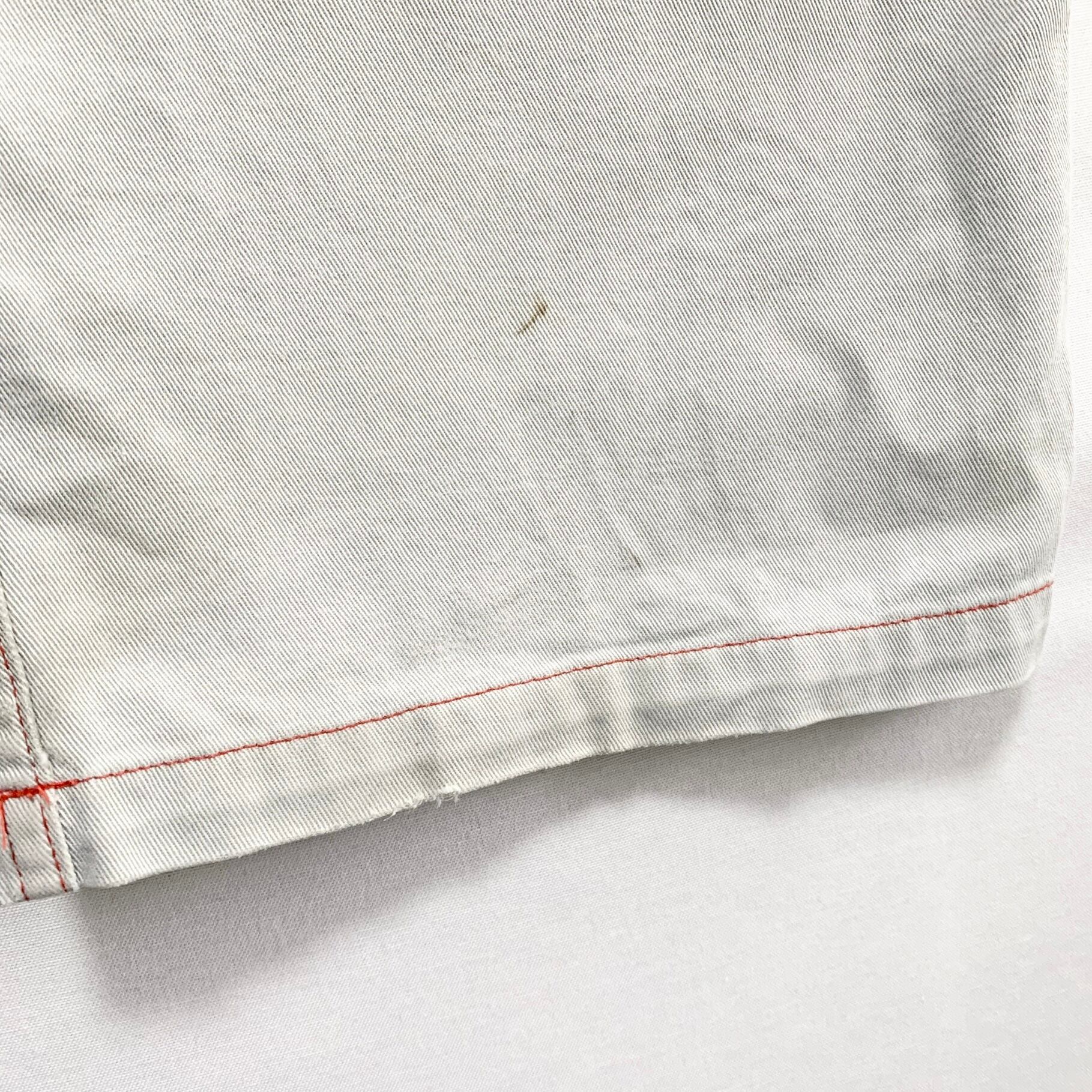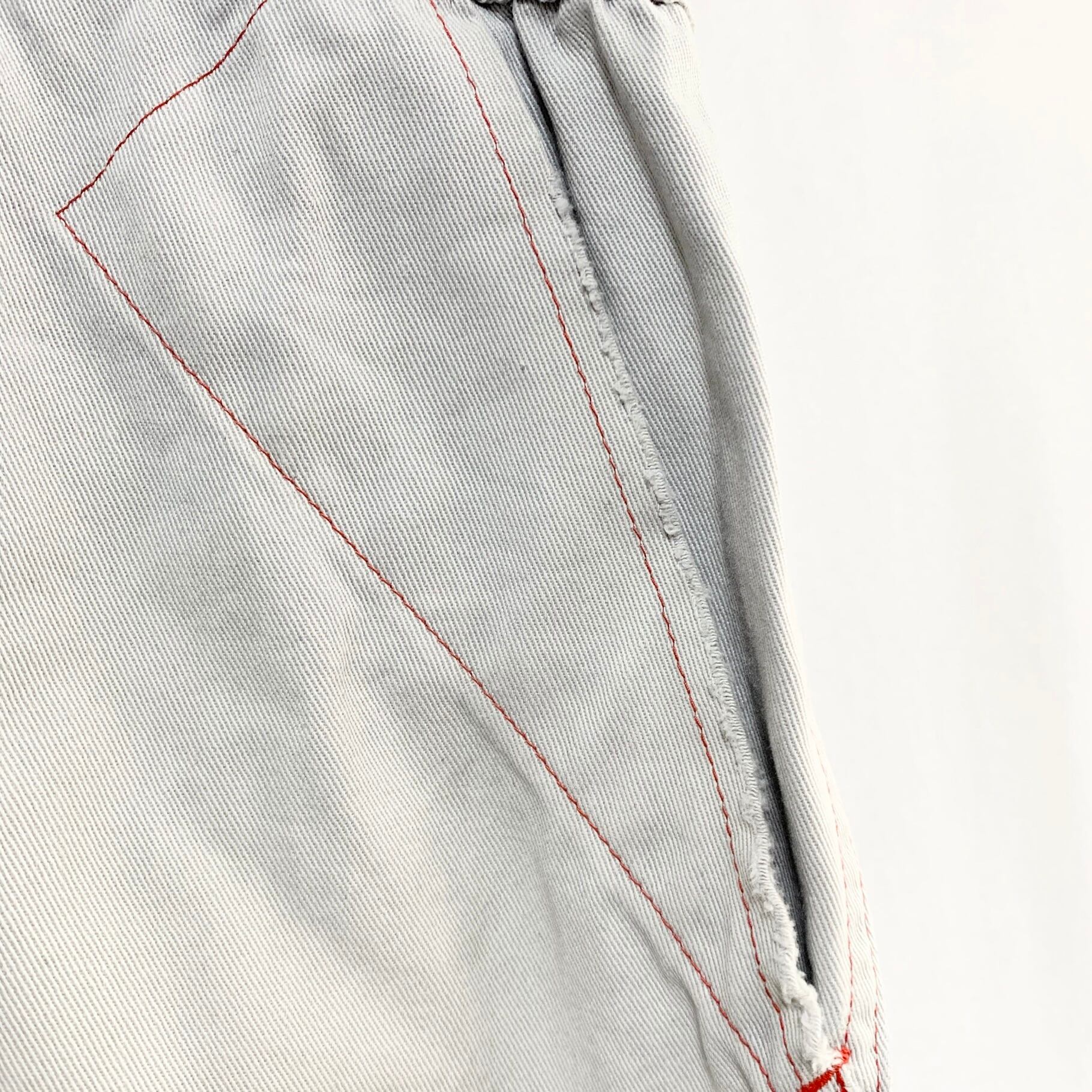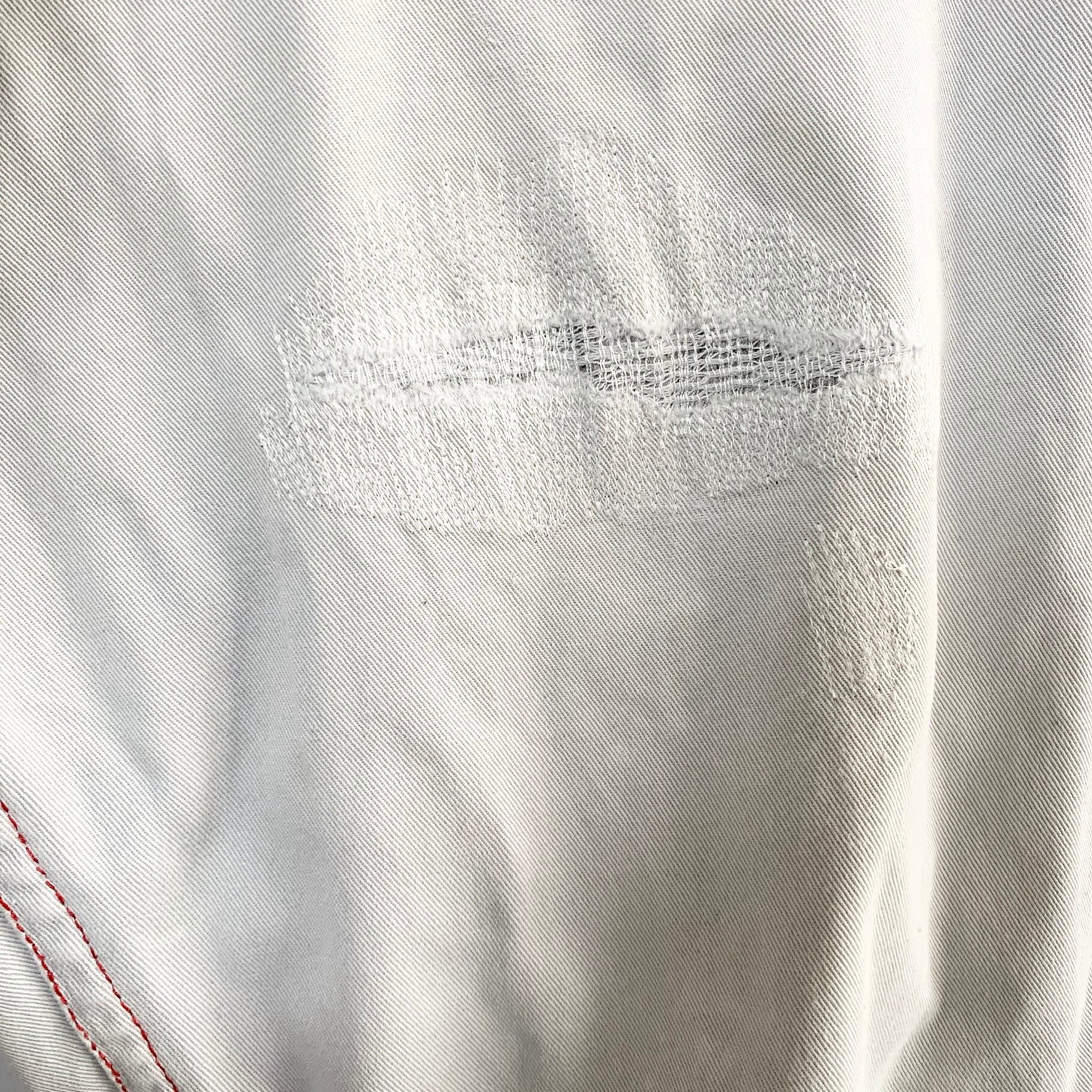 襟ぐりと左膝に破れがあったので叩きリペアを施しています。足部分がセルビッジではなく2本ステッチの巻縫いであったため、綴じのみ手縫いで縫いました。