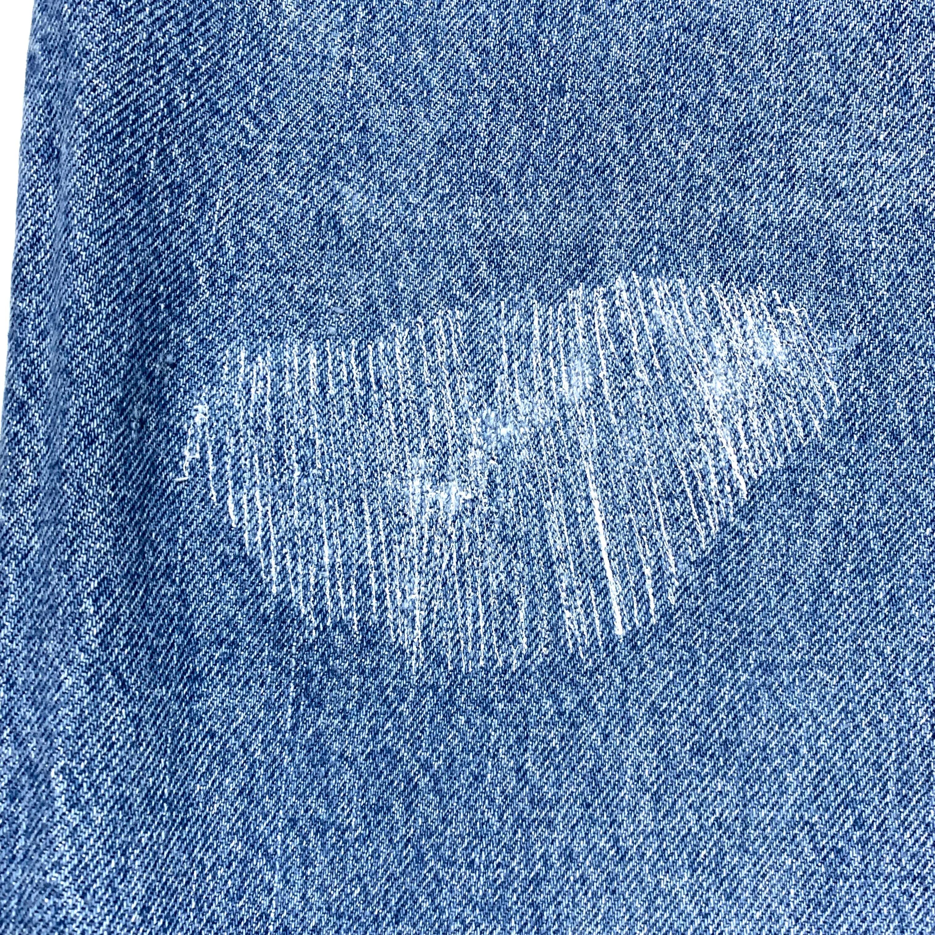 その下部あたりと、右裾付近に破れがあったためリペアを施しています。白糸を使ったのですが、デニムの染料がまだ強めに残っている為少し色が浮いています。穿き込んでいく内に馴染むかと思います。